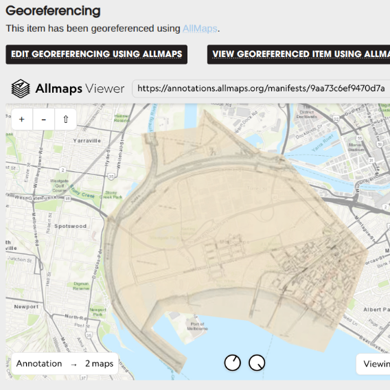 I’ve just created a workflow that uses AllMaps and IIIF to georeference the SLV’s digitised maps. There’s some technical details below, but the idea is pretty simple. A userscript links the SLV image viewer to Allmaps – so you just click on a button, and the digitised map opens, ready for georeferencing.