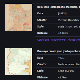 The State Library of Victoria holds a collection of 8,804 parish maps. As part of my residency at the SLV LAB, I’ve been poking around in the metadata. We could create bounding boxes by using something like AllMaps or MapWarper to georeference each individual map, but that’s going to take a while! As a quick and dirty alternative, I wondered if it was possible to generate approximate bounding boxes from the available metadata. It seems we can!