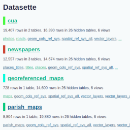 Datasette instance containing data with spatial coordinates from parish maps, CUA, newspapers, and georeferenced maps.